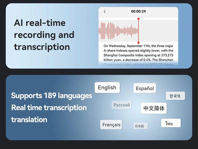 3.[Al real-time recording and transcription]: Supports 58 languages Real time transcription. 58 languages: Chinese, English, Korean, Japanese, Russian, Spain, Portugal, Arabic, German....Note: Only supports converting the same language to text.